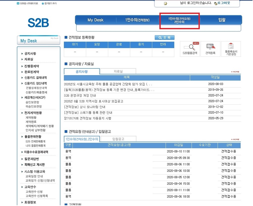 3.S2B 전체화면이 나타나는데 상단 메뉴 1인수의(견젹요청),2인수의(이건 업체마다 다를 수 있으니 확인해보셔야 합니다.) 클릭