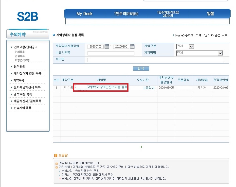 4.계약대상자 결정 목록 화면이 나타나고 계약명을 클릭합니다.