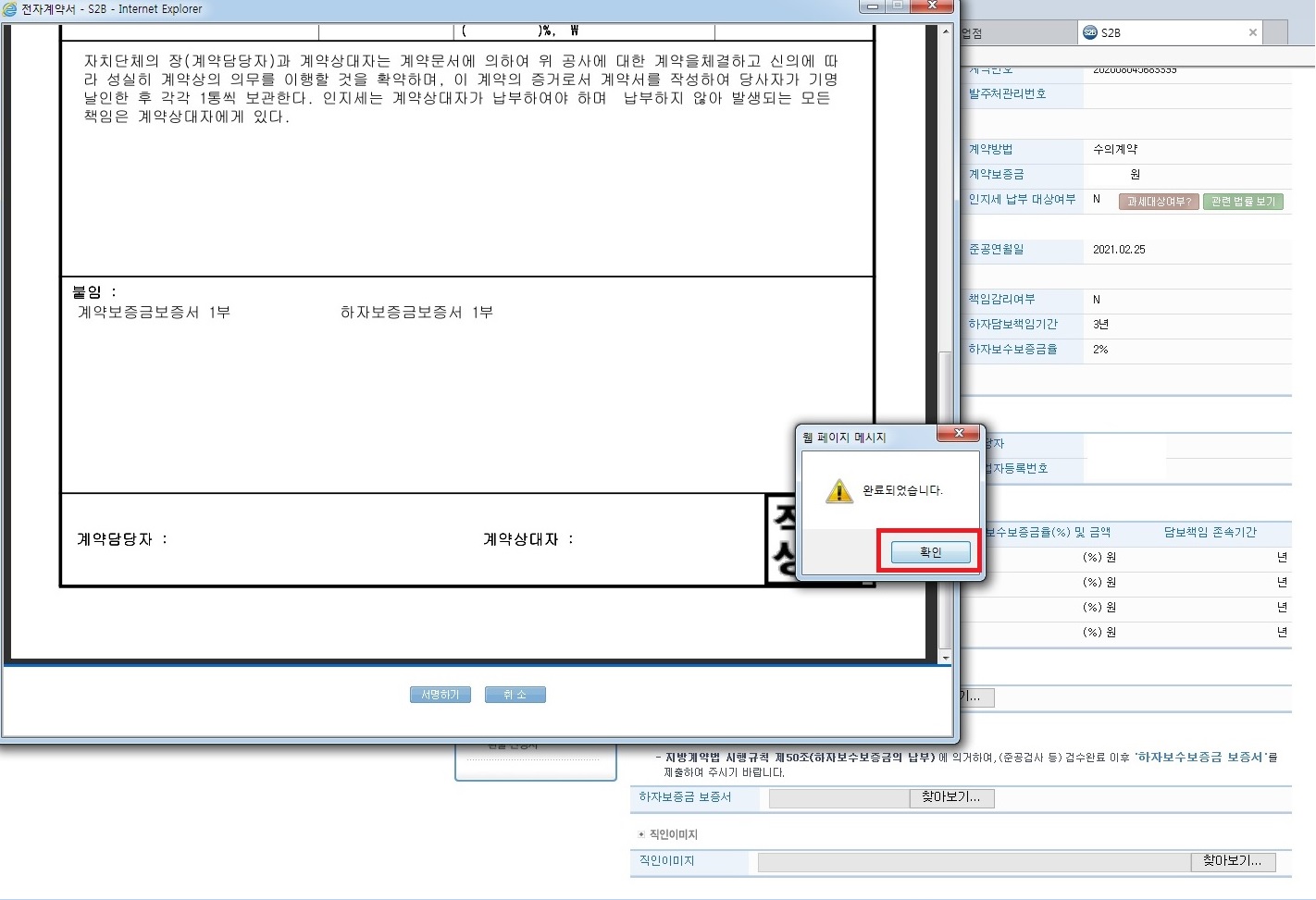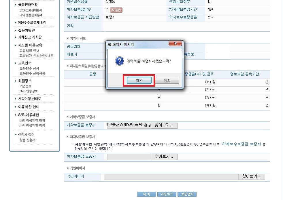 12.첨부 완료 후 아래쪽에 서명하기 클릭. 하자보증금 보증서 미첨부라는 알림창이 뜨는데 무시하고 확인 클릭.