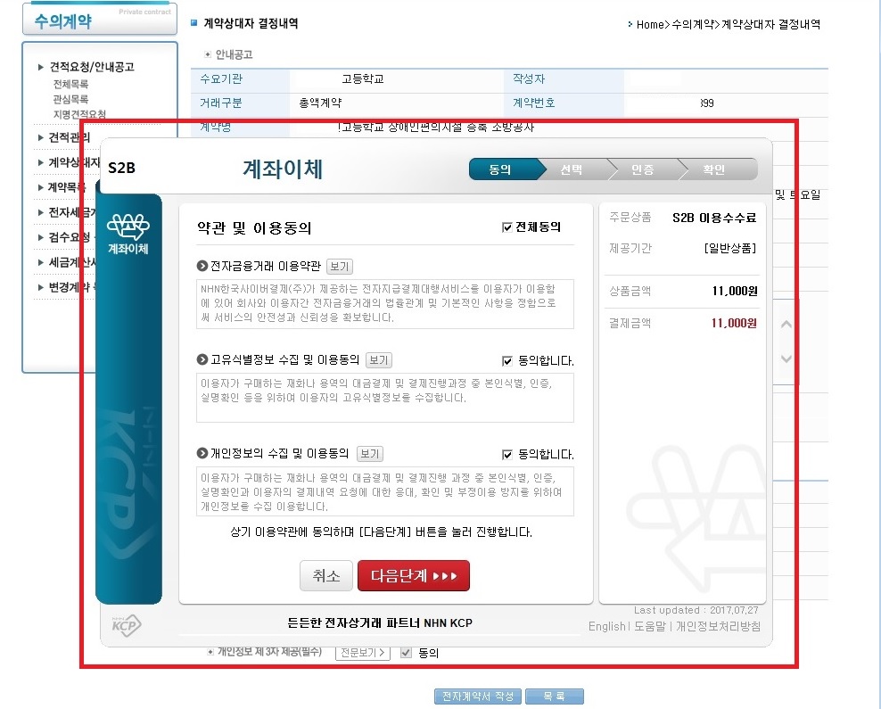 8.저는 대부분 회사 계좌로 이체하기 때문에 계좌이체를 선택했다. 순서에 맞춰서 결제하면 됩니다.
