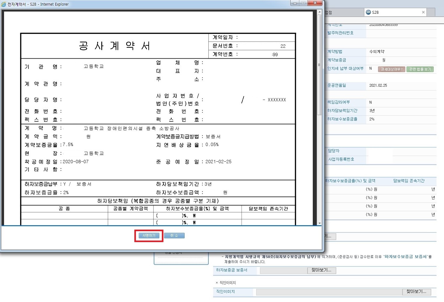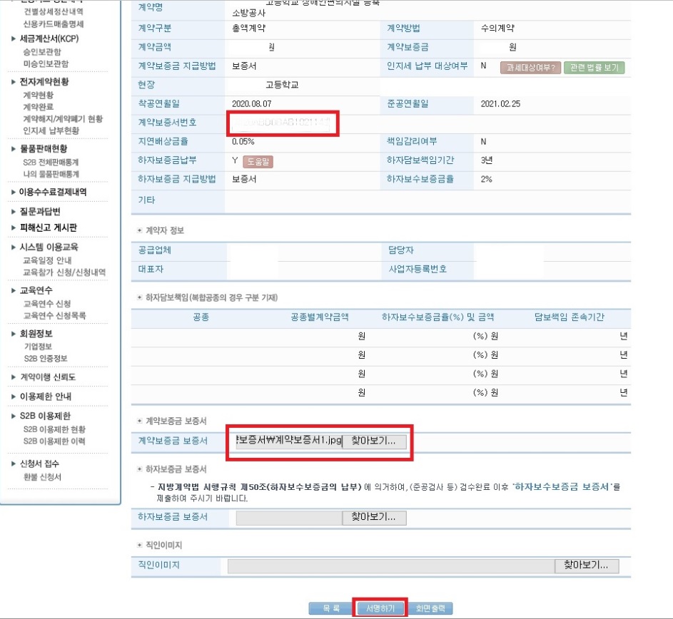 11.공제조합에서 계약보증서를 발행한 후 계약보증서번호 입력 및 보증서 첨부가 완료되면 서명하기 클릭