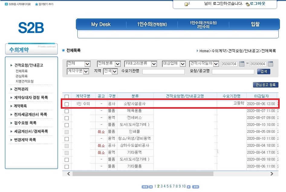 해당 공고가 나오면 견적요청명/안내공고명을 클릭합니다.