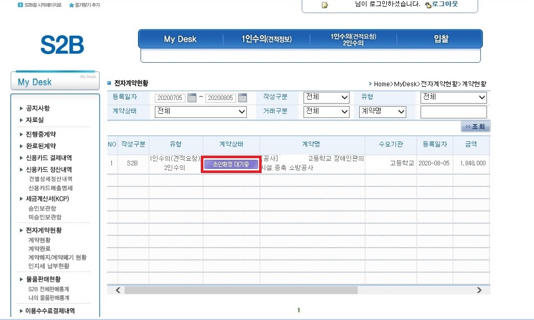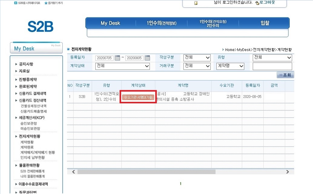 15.전자계약현황 화면으로 바뀌고 계약상태가 초안확정대기중에서 수요기관 서명대기중으로 변경되어 있습니다.