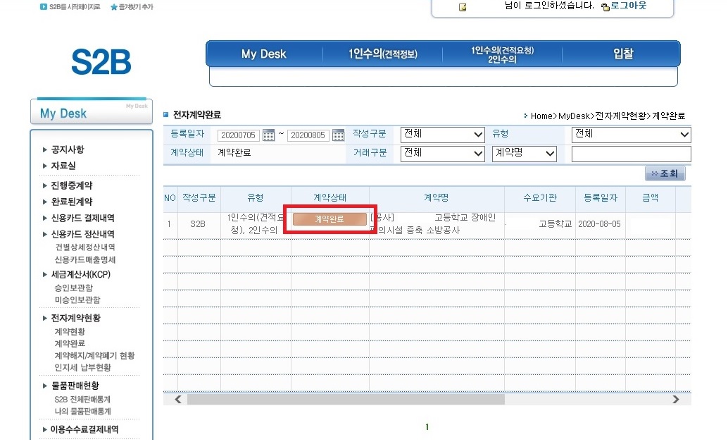 좌측 메뉴 - 계약완료 클릭