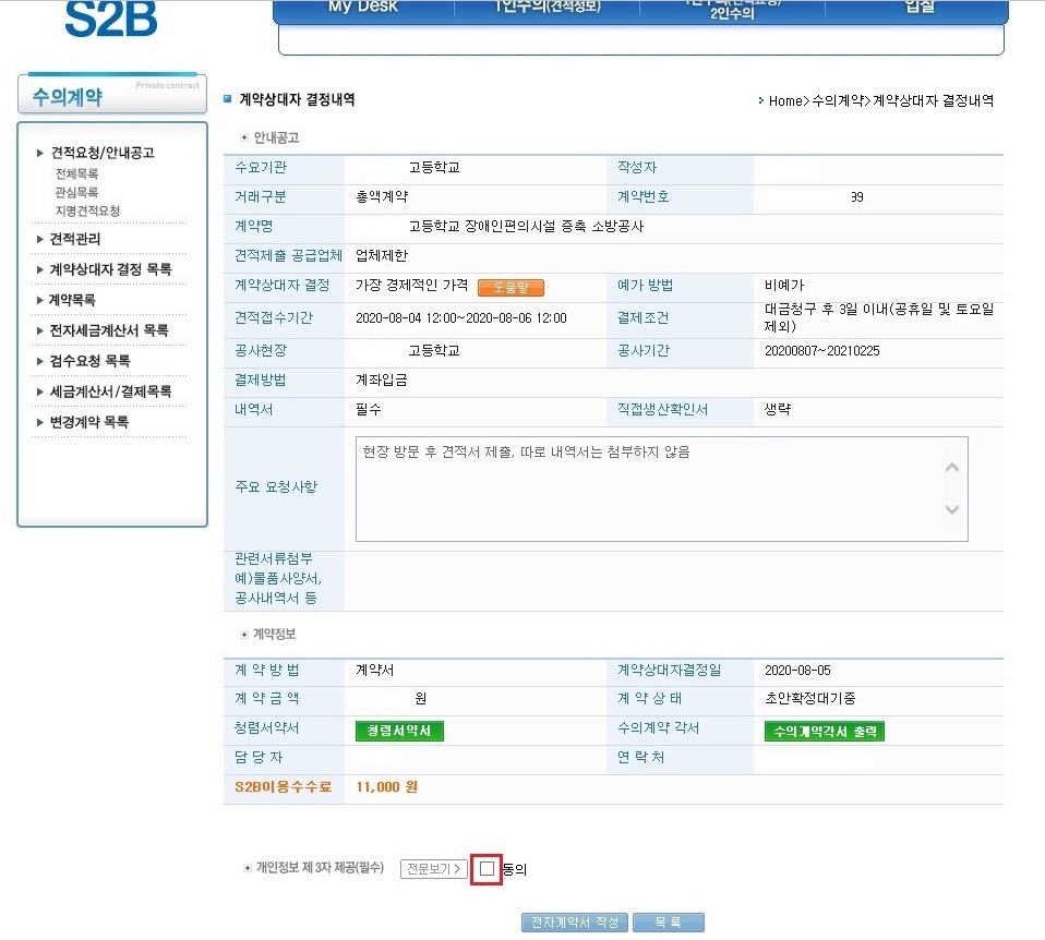 먼저, 공고가 나오면 견적서 작성 후 제출을 하고 학교에서 계약대상자결정을 한 후 계약을 진행합니다.