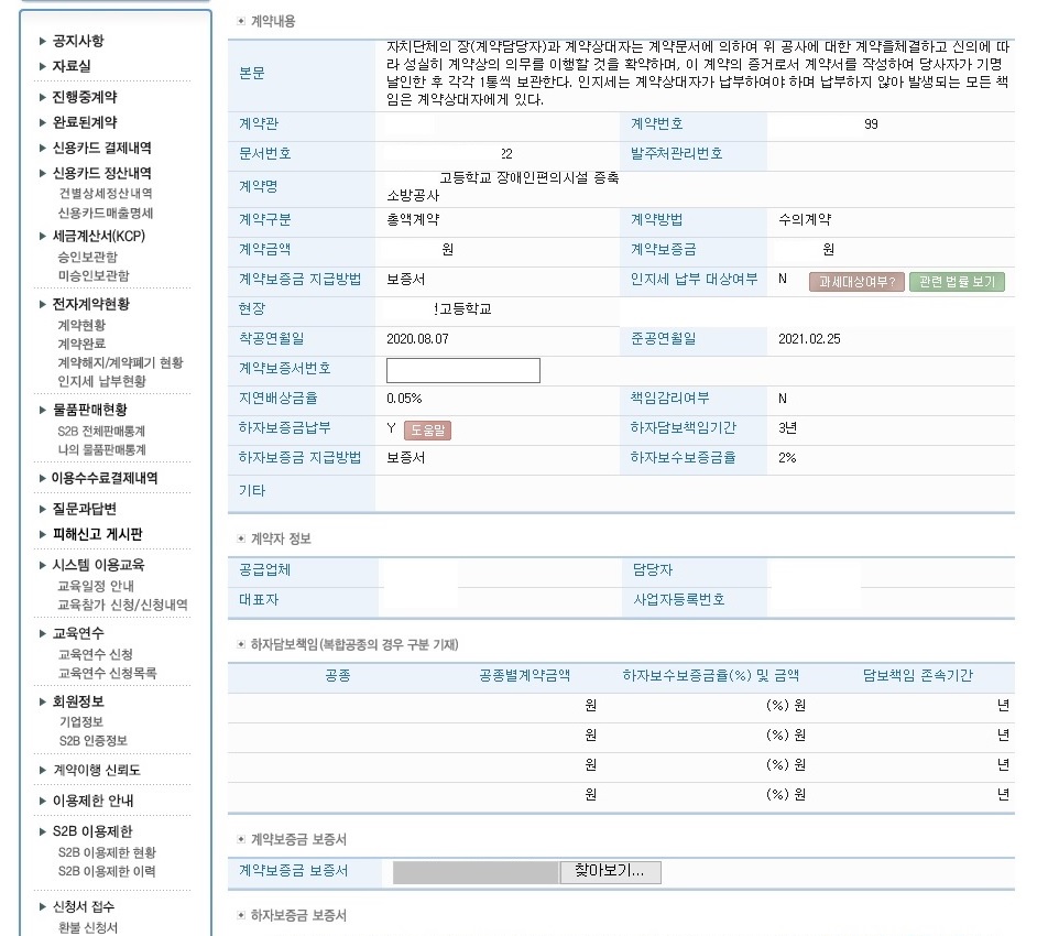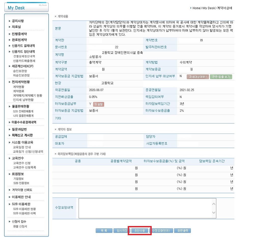 10.초안수용 클릭하면 계약보증서번호 입력과 보증서 스캔사본 첨부를 할 수 있는 계약내용 화면이 나타납니다.