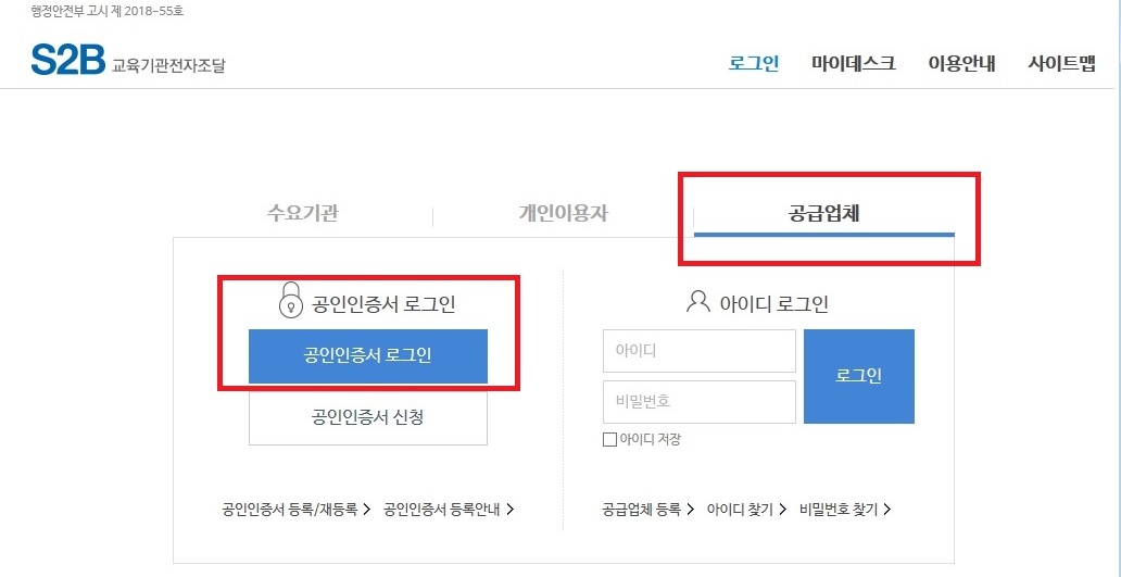 2.공급업체를 클릭하고 공인인증서 로그인을 합니다.
