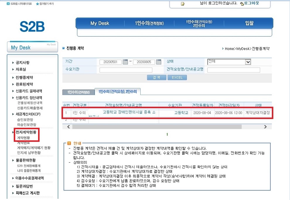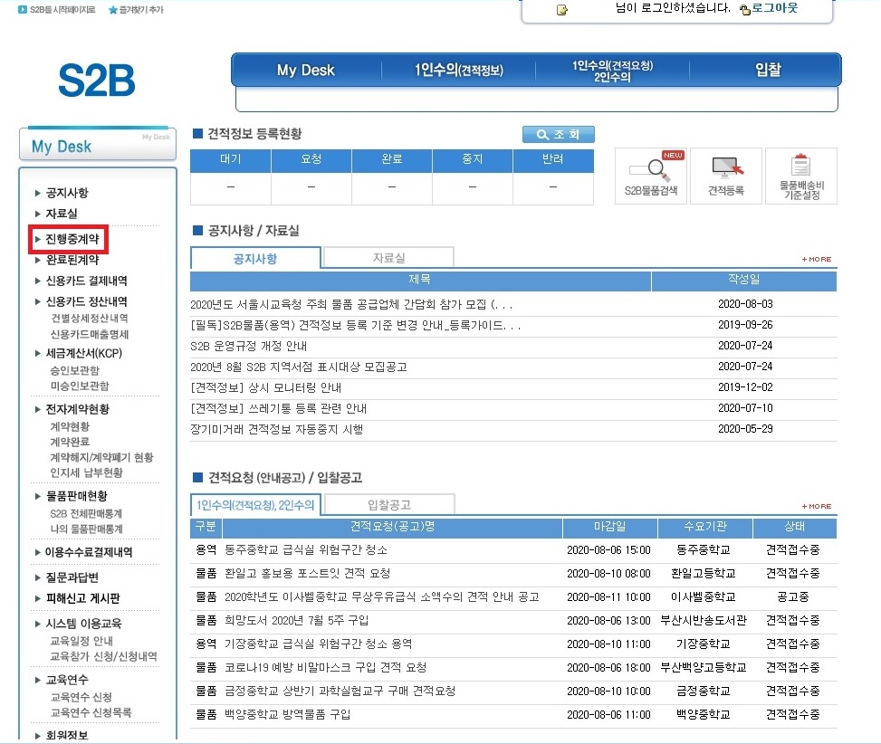 S2B 전체화면에서 좌측 메뉴 진행중계약을 클릭합니다.