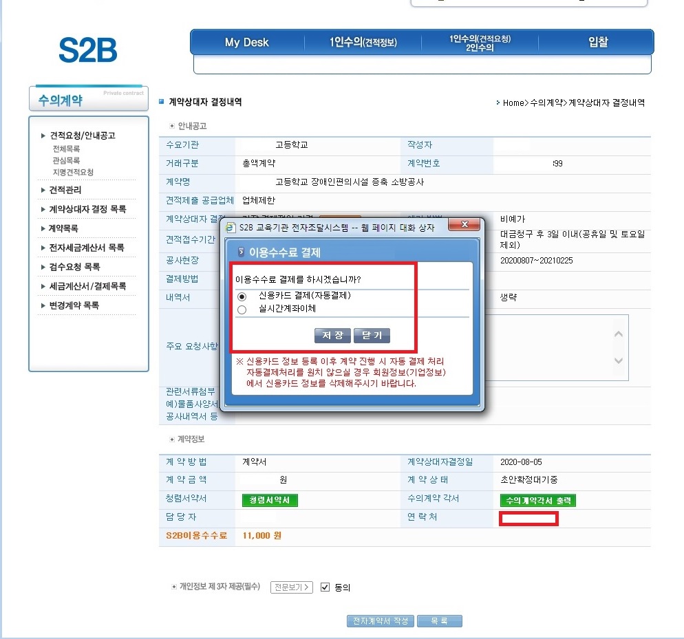 7.전자계약서 작성을 클릭하면 이용수수료 결제 새창이 뜨고 결제 방법을 선택한 후 저장 클릭