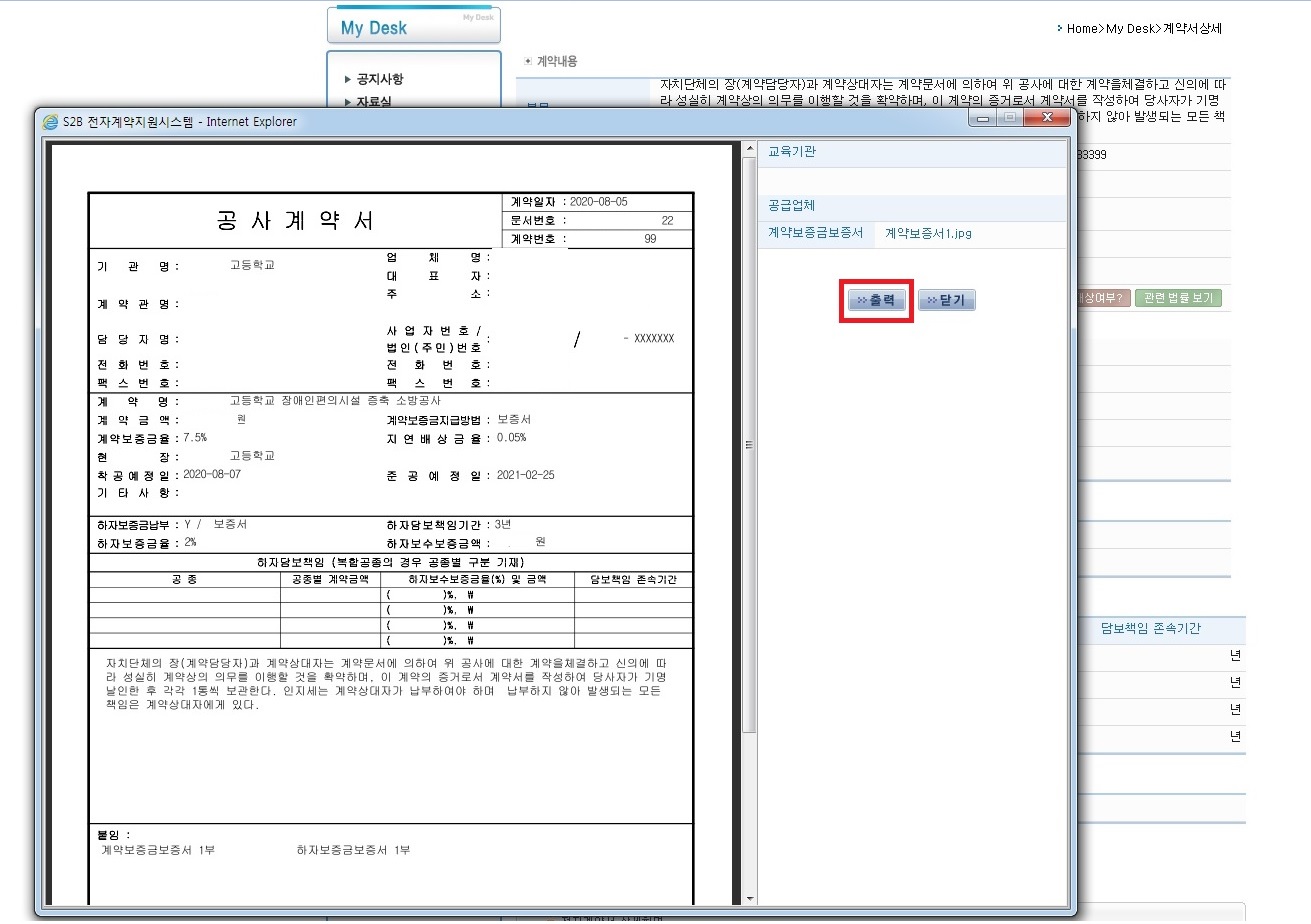19.공사계약서 새창이 뜨고 출력 클릭